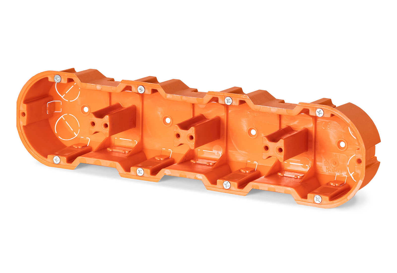 Produkt wykonany został z trwałego tworzywa sztucznego w kolorze pomarańczowym, co zapewnia jego wysoką odporność na uszkodzenia mechaniczne oraz łatwą identyfikację podczas prac instalacyjnych. Puszka podtynkowa  wyposażona jest w solidne mocowania, które gwarantują stabilny montaż w ścianie.